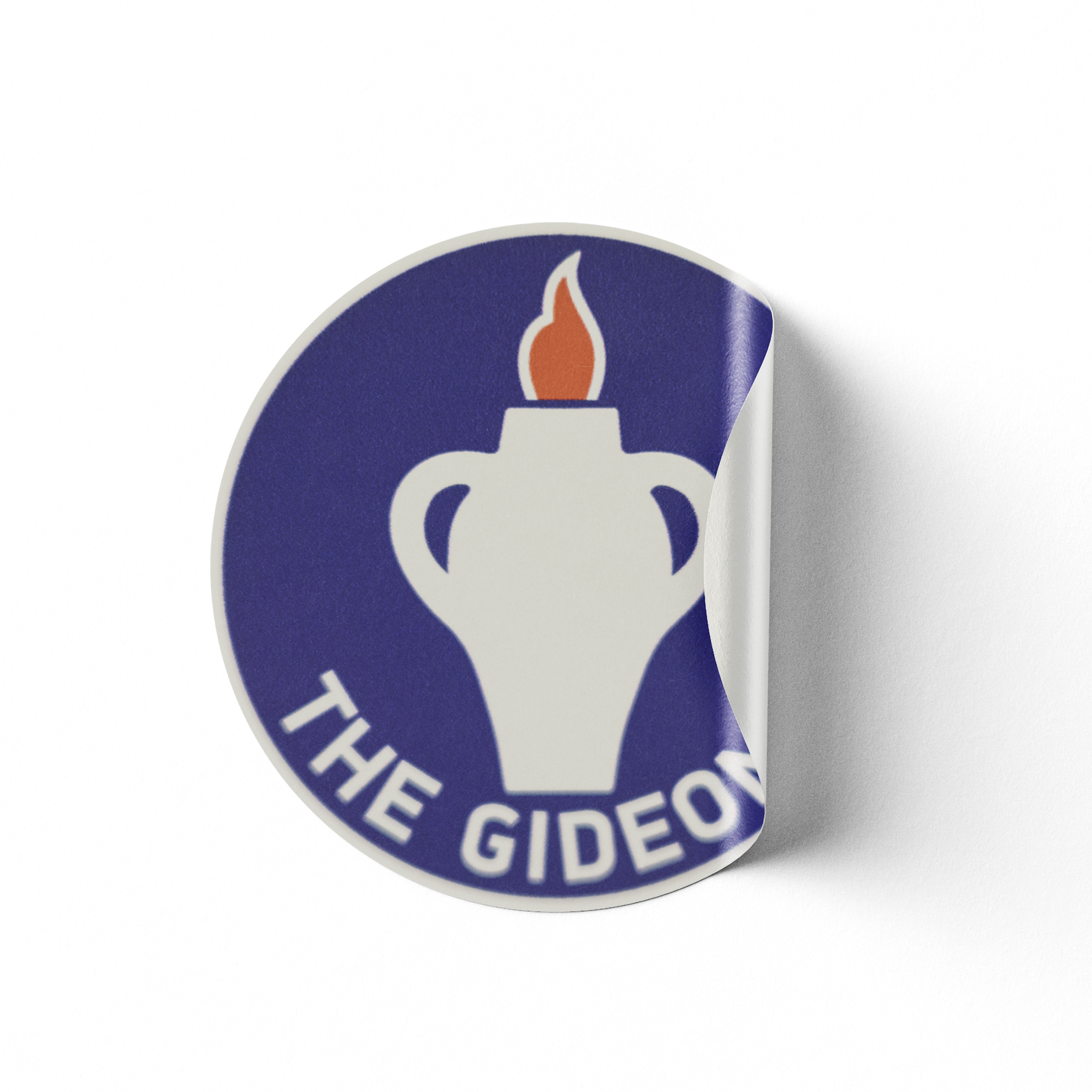 8cm stick-on Gideon emblem for use as a bumper sticker on your car or labelling materials and equipment.