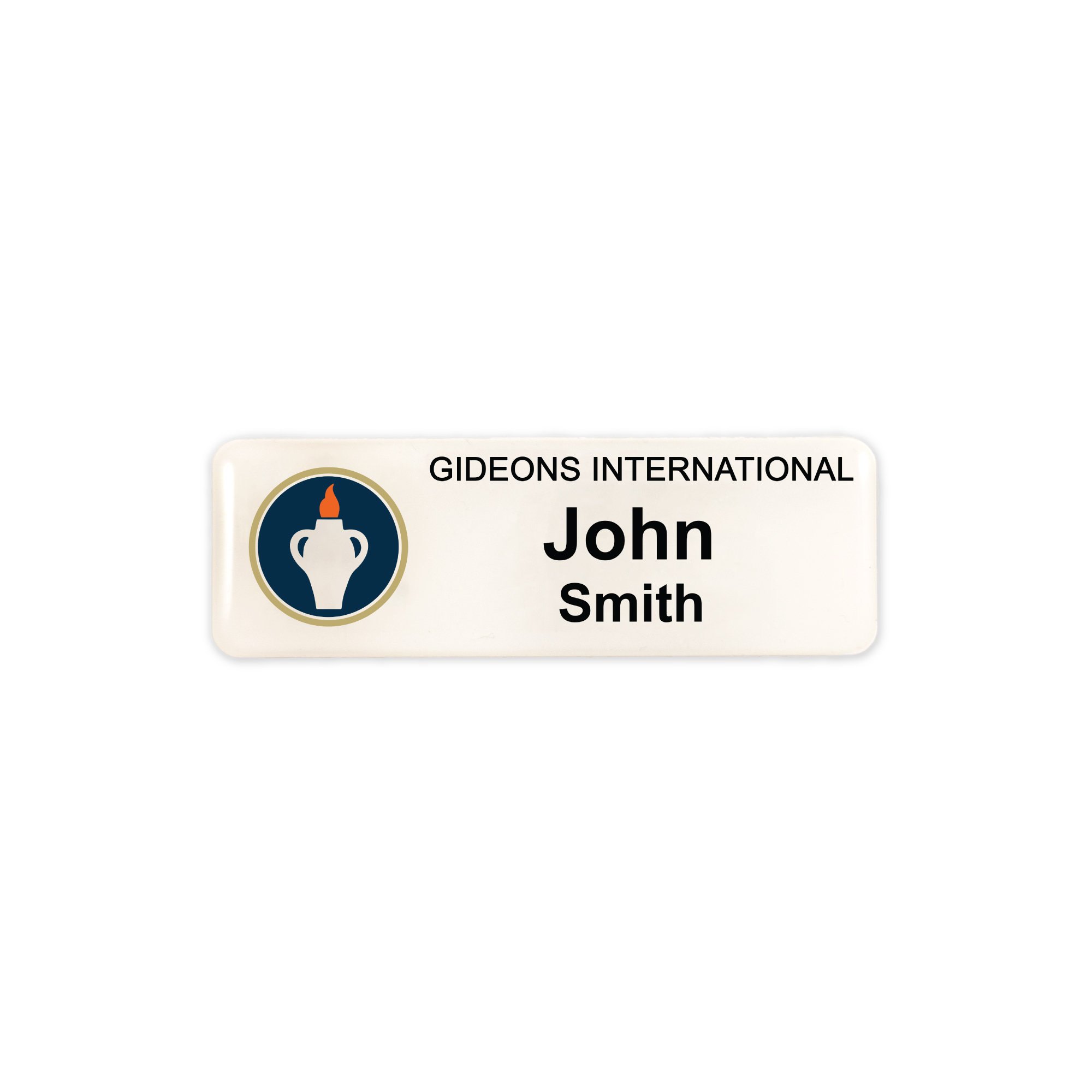 Gideon name badge with safety pin and pocket clip to be worn during meetings, events and Scripture distributions. Desired name must be advised in the Comments section when ordering.