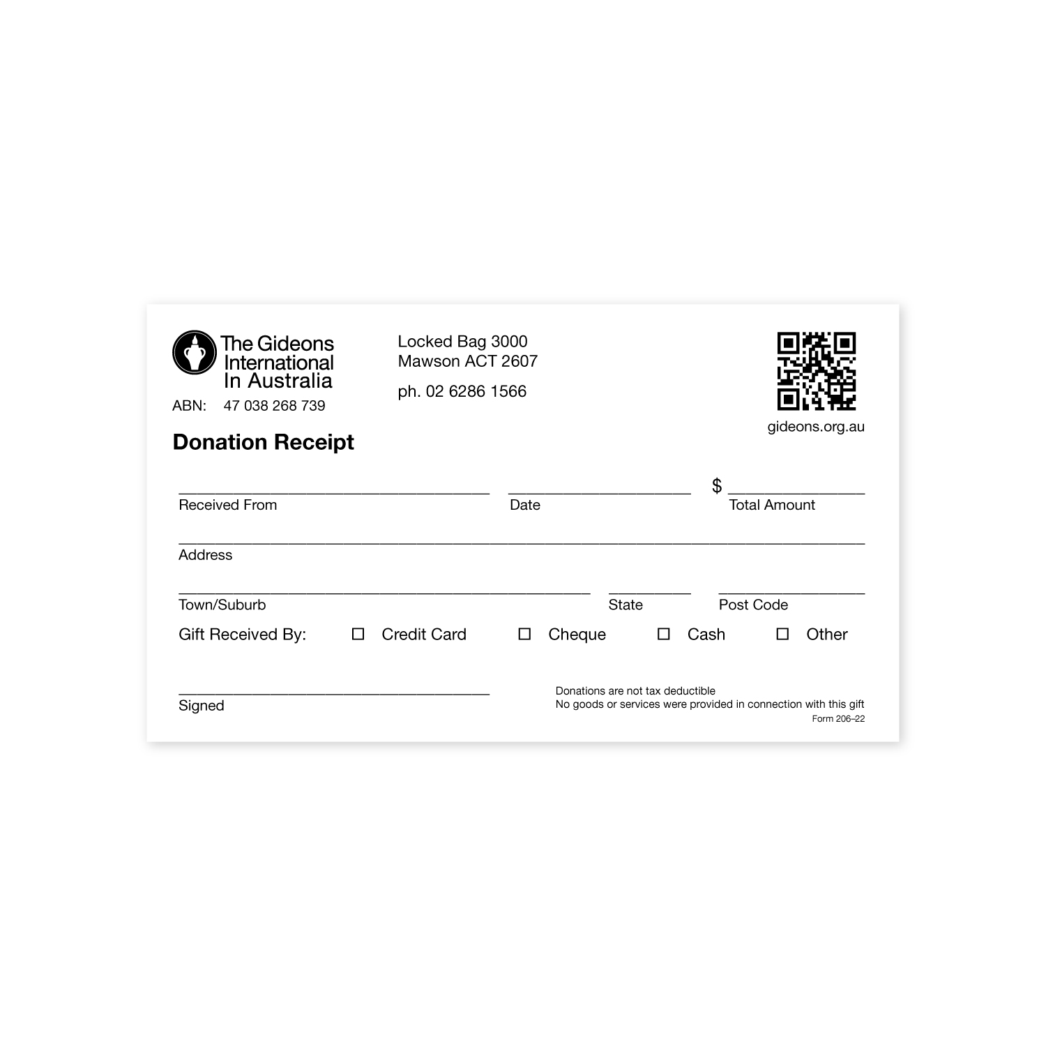 Pad of 25 receipts (with carbon copies) used by the camp treasurer at camp meetings or a church presenter at church presentations to acknowledge large gifts and donations.